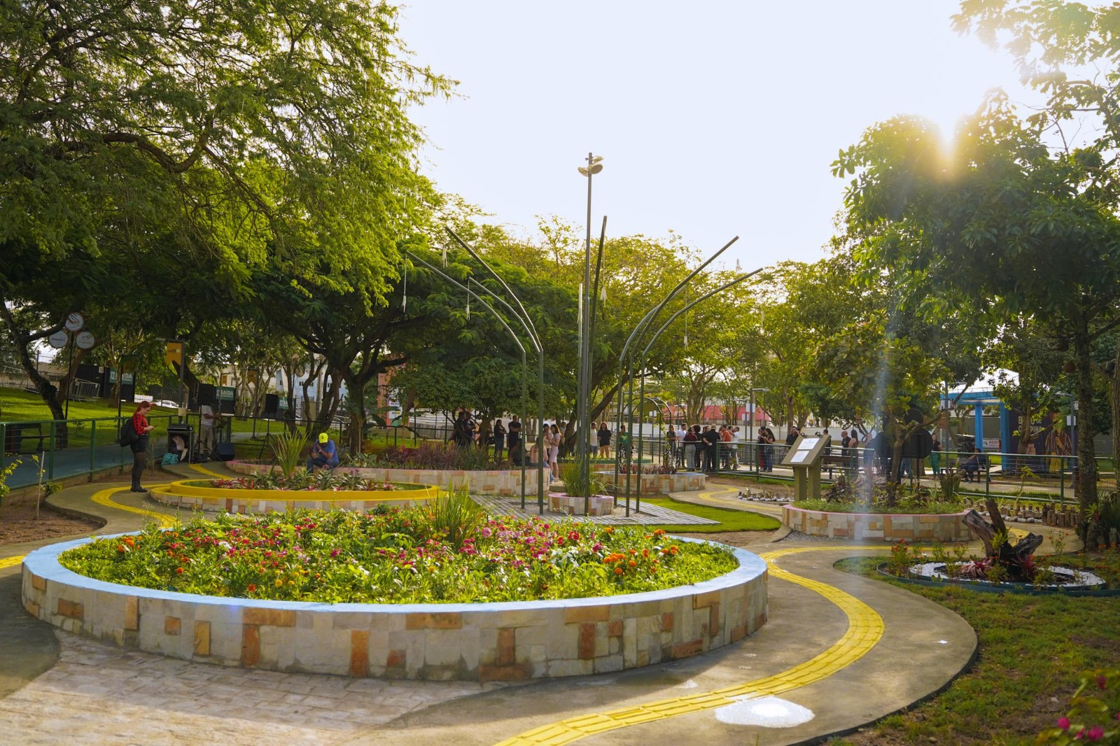 Cada círculo conta com pisos diferentes, como tátil, alvenaria, grama, pedras naturais e materiais ecológicos, além de pontos de iluminação que permitem uma experiência sensorial também durante a noite.